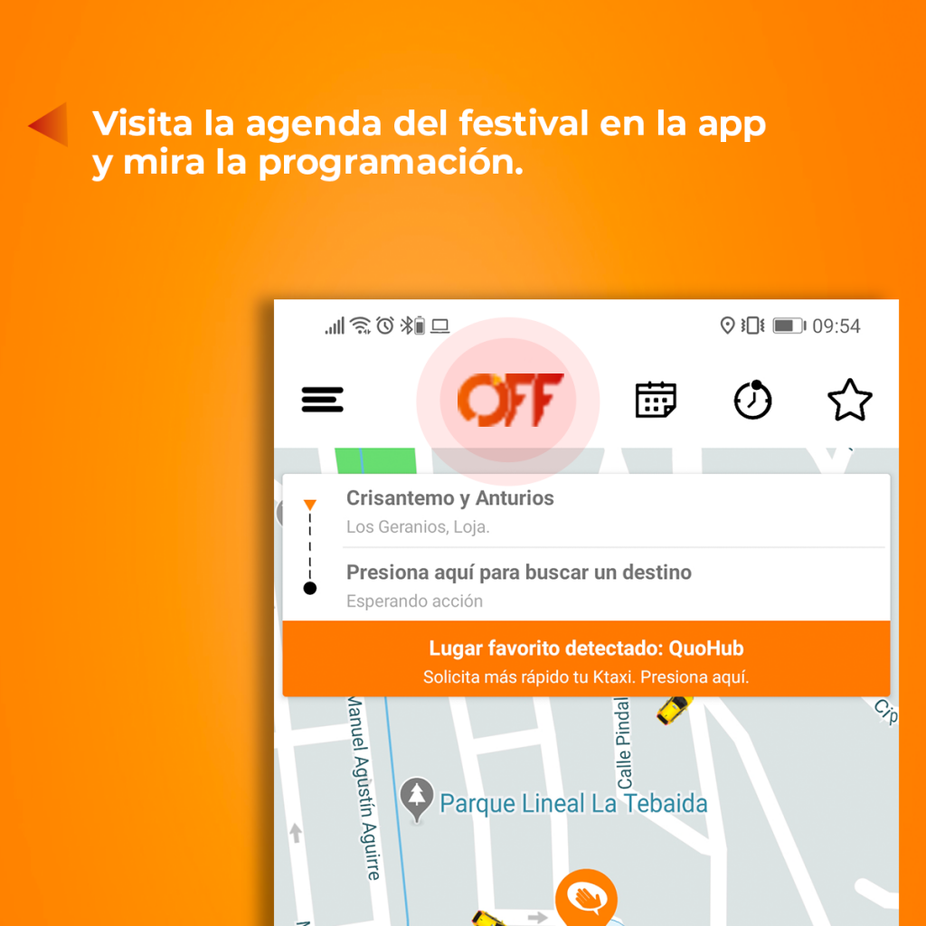 En el app podrás encontrar la agenda del Festival Off y viajar a los diferentes eventos en Ktaxi.